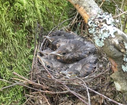 Talumetsas kännu otsas puuriida ääres olev pesa. See riit jäi välja vedamata, et linnupoegi ja linnuemmet ei häiriks.